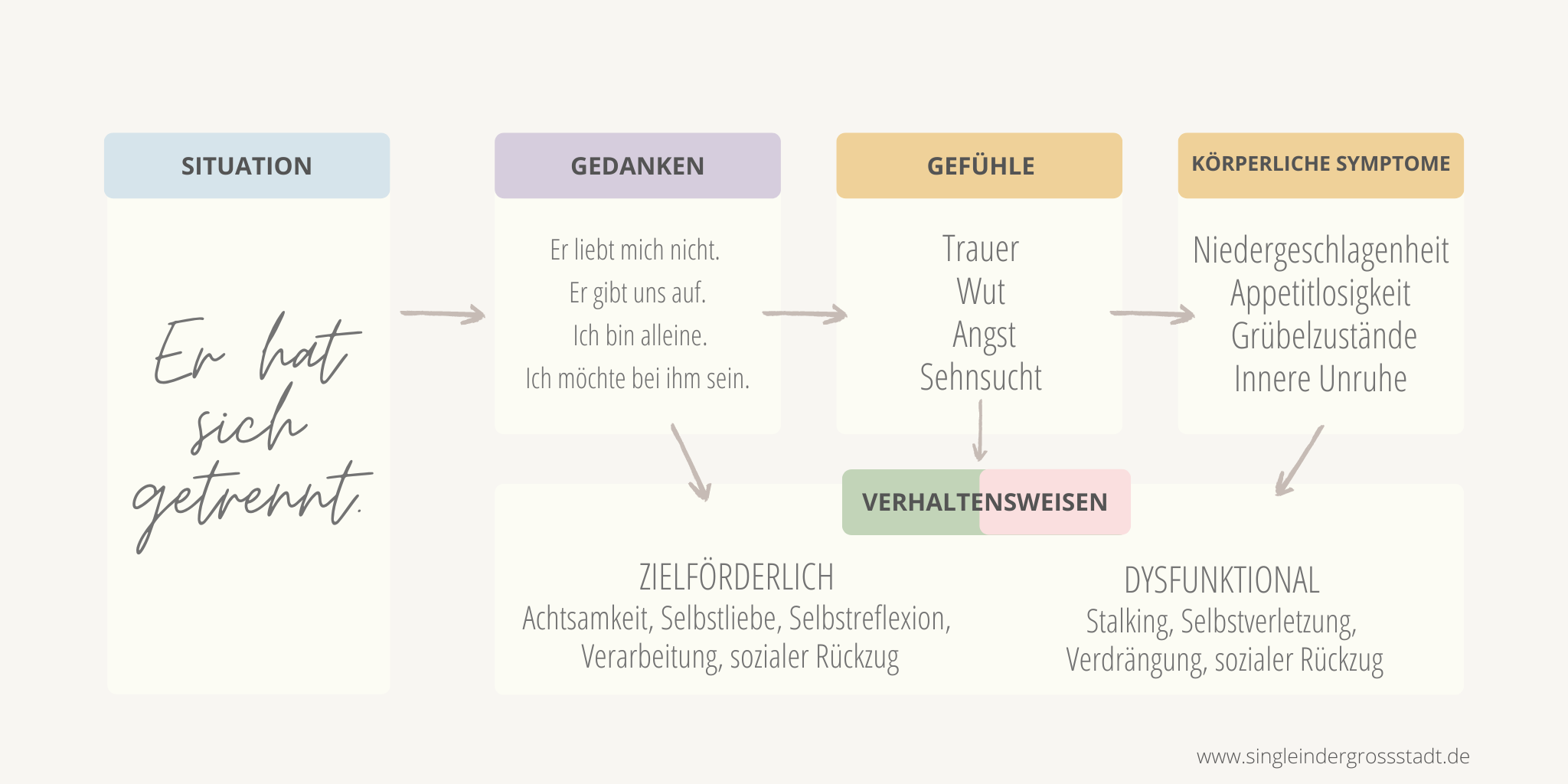 Das hilft: Als erstes, es ist wie es ist und das Leben des anderen geht einen nichts mehr an. Die Gedanken drehen sich im Kreis, man sucht nach Antworten, aber es wird keine geben, die einen befriedigen. Es wird nicht besser und man steigert sich immer mehr hinein, worauf der Körper mit Stresssymptomen reagiert. Es ist Zeit für einen Gedanken-Stopp, eine sehr gute Übung seine Gedanken zu durchbrechen ist die A-Z Übung. Beispiel: weibliche Filmstars: Angelina Jolie, Brigitte Bardot, Cameron Diaz usw. oder Stricken, es entspannt und ganz nebenbei entsteht ein neuer Schal, worüber man sich freuen kann. Naja, oder ganz viele Schals, wo sich Freunde und Familie darüber freuen.