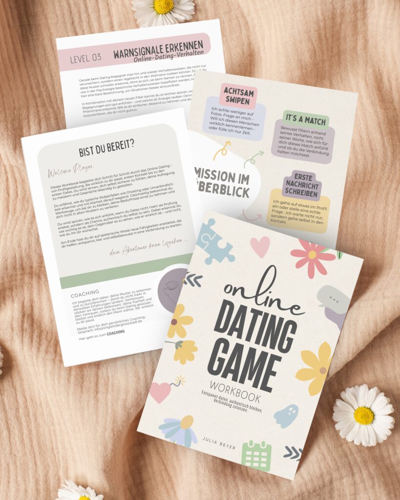 Ich durfte das Online Dating Games Workbook vorab testen – und ehrlich, ich hätte nie gedacht, dass mich das so zum Nachdenken bringt. Ich war total im Modus, Männern zu gefallen. Immer angepasst, immer überlegt, was ich sagen soll, damit ich interessant rüberkomm.