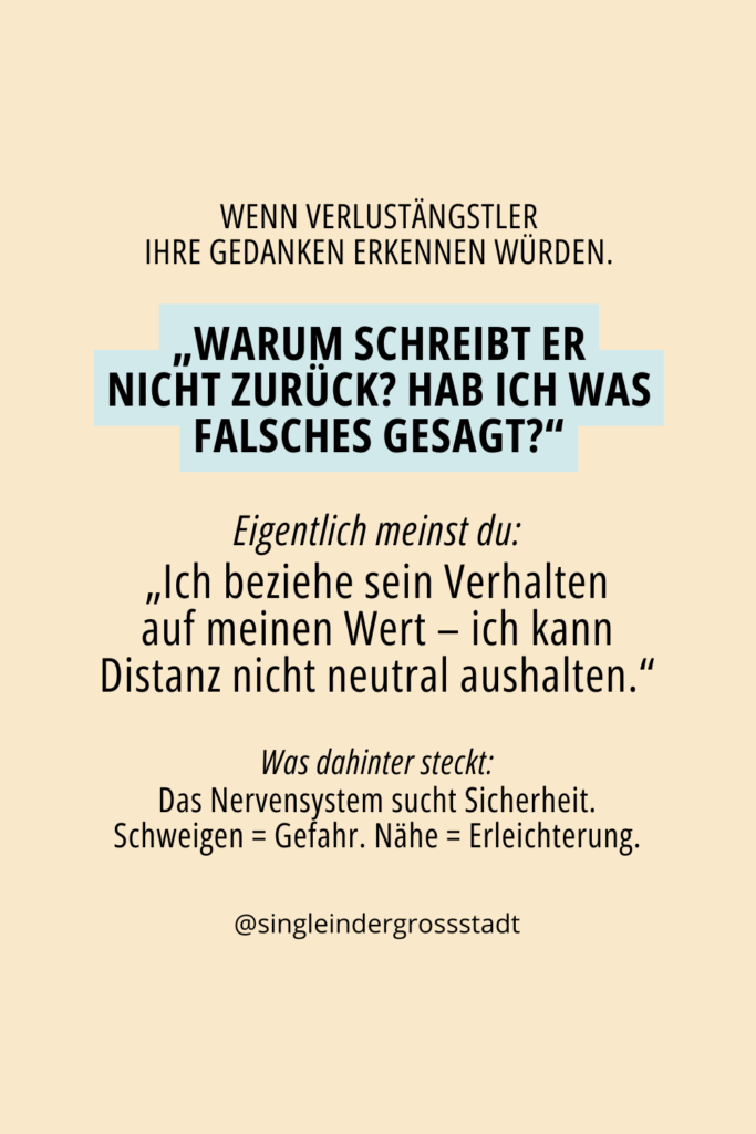 ➡️ Was wirklich passiert: Dein Nervensystem sucht Beruhigung. Schweigen triggert dein altes Muster von „Ich werde gleich verlassen“.